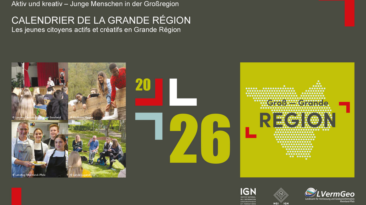 Der Wandkalender ist ein Produkt der Arbeitsgruppe Kataster und Kartografie der Großregion. Erstmalig wurde er in diesem Jahr in Kooperation mit der Arbeitsgruppe „Jugend" der Großregion erarbeitet, die die Motive für diese Ausgabe des Wandkalenders ausgesucht und zur Verfügung gestellt hat.